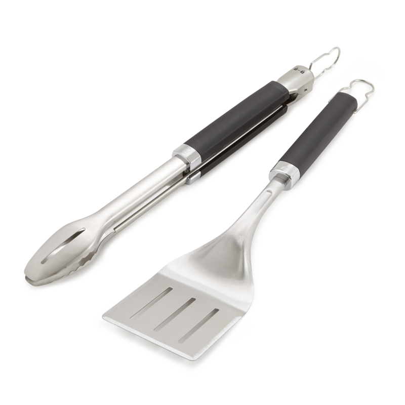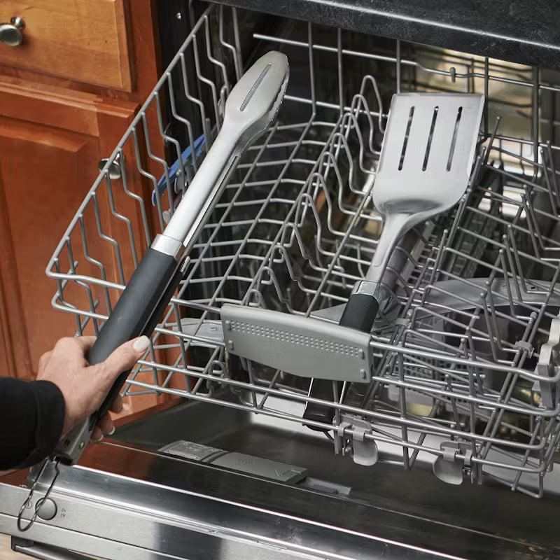 The Precision Grill Tongs & Spatula Set is designed for performance. Both feature a durable stainless-steel construction and soft-touch handle for comfort and control. The hands-free locking tongs are designed with a flat front edge that provides a secure grip as you lift and turn fragile foods. The spatula features a 3-sided beveled edge to easily slide under foods. Both tools are dishwasher-safe for easy cleaning.