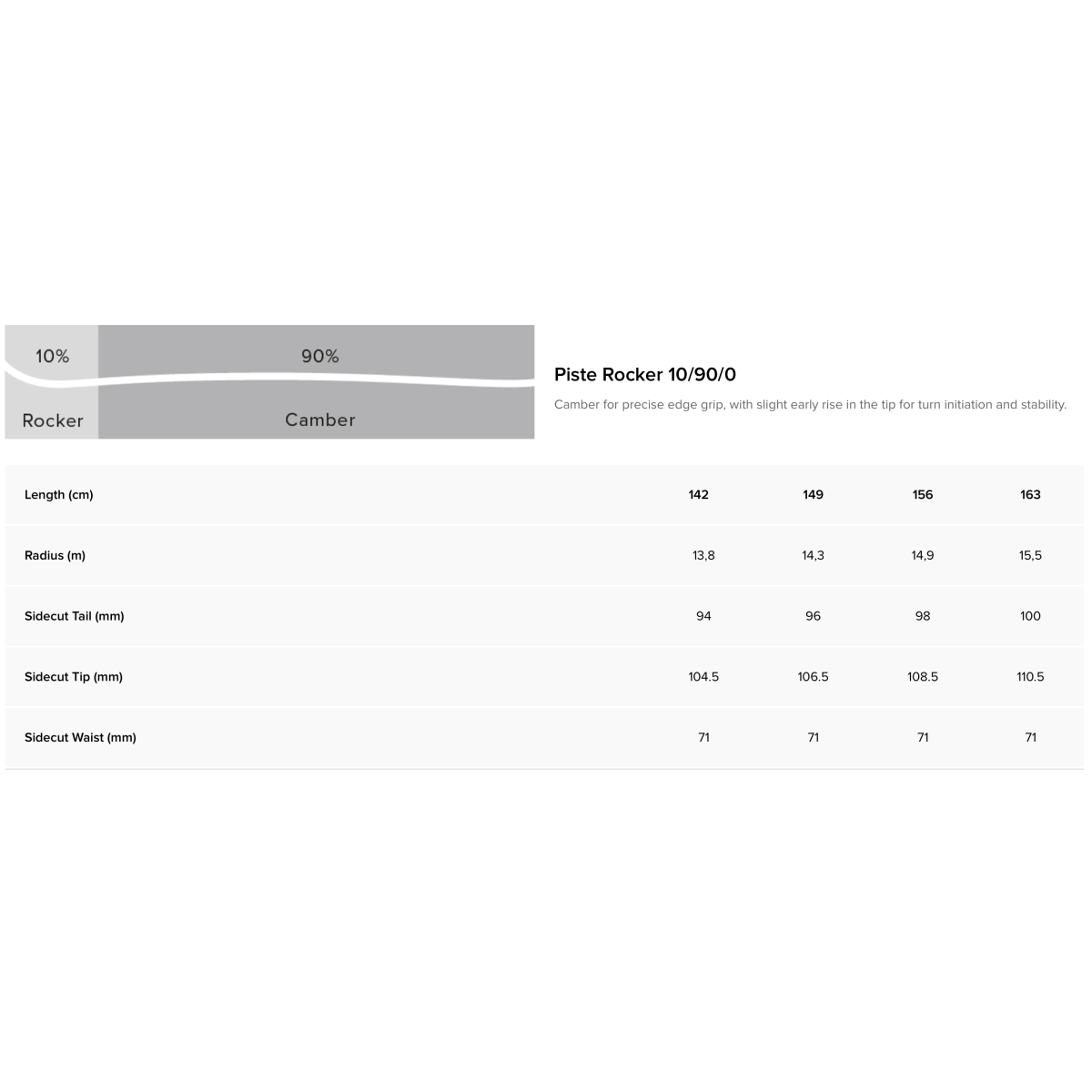 - Piste Rocker 10/90/0 - Camber for precise edge grip, with slight early rise in the tip for turn initiation and stability.