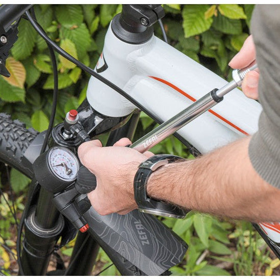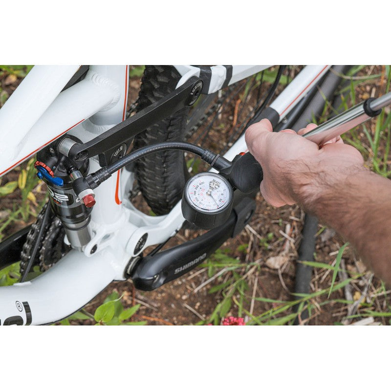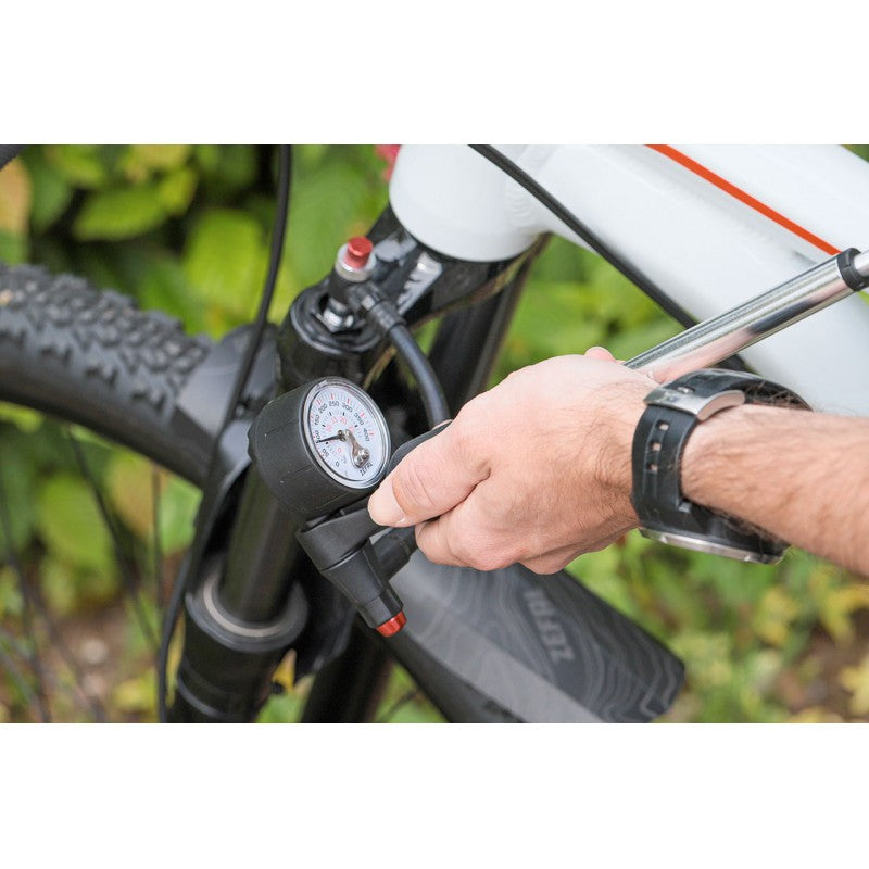The Z Shock is a mini pump for forks and shocks that combines precision, performance, simplicity and comfort. It is efficient and can reach high pressures of up to 360 psi (25 bar). The two-stage operation allows the valve to be sealed first and then the inner tube to be opened without the risk of pressure loss. This mountain bike shock pump is universal and fits all suspension fork and rear shocks. The integrated pressure gauge gives an accurate and easy reading of the pressure. The Z Shock is made entirely of aluminium, which makes it durable, light and corrosion resistant.