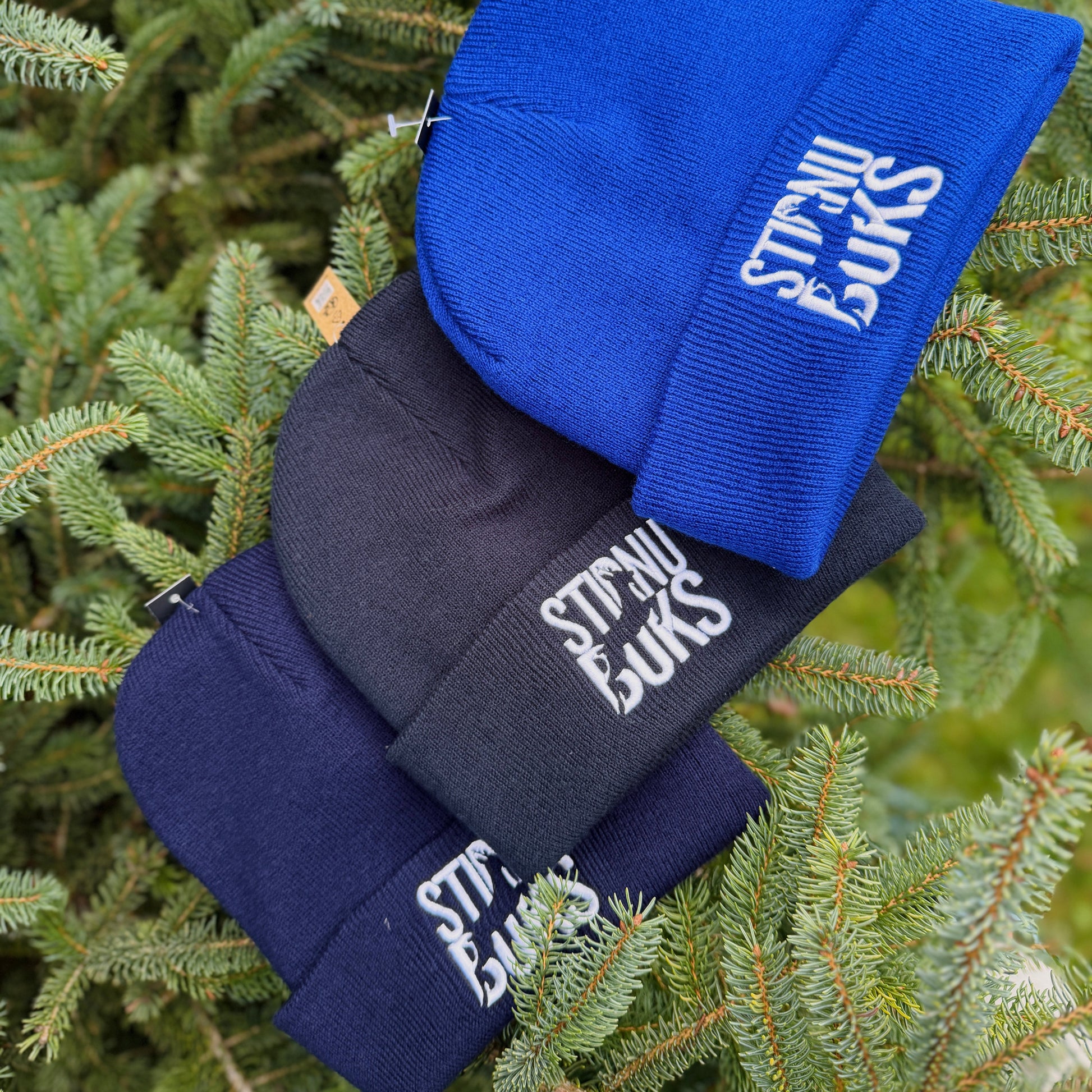 Adīta cepure ar atlokāmu malu un izšūtu STIRNU BUKS logo priekšpusē — lieliski piemērota gan ikdienai, gan aktīvām pastaigām dabā vēsākā laikā.