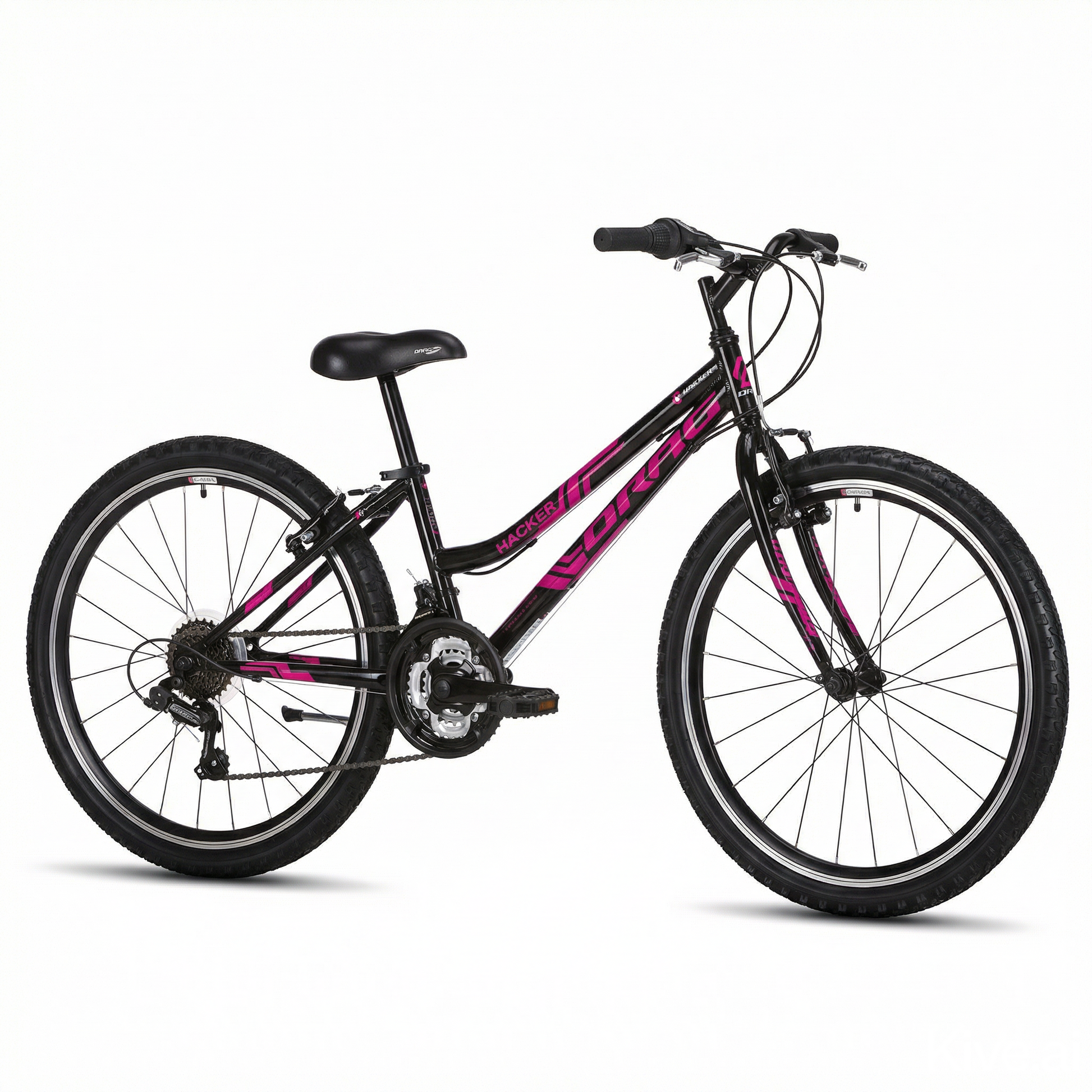 Classic kid and woman MTB bicycle in black/pink paint. This mountain bike has alloy frame with hi-ten suspension, 26 inch wheels, Shimano Tourney 3x6 drivetrain and v-brakes. Solid biking buddy for daily rides and commutes on various types of surfaces/roads.